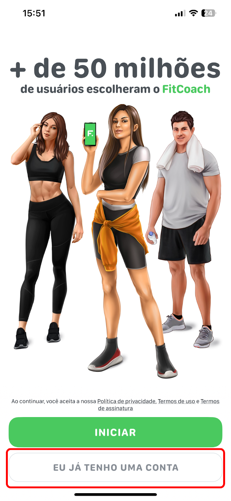 2. Abra o aplicativo e clique no botão "Eu já tenho uma conta" na primeira tela do aplicativo, conforme mostrado abaixo: